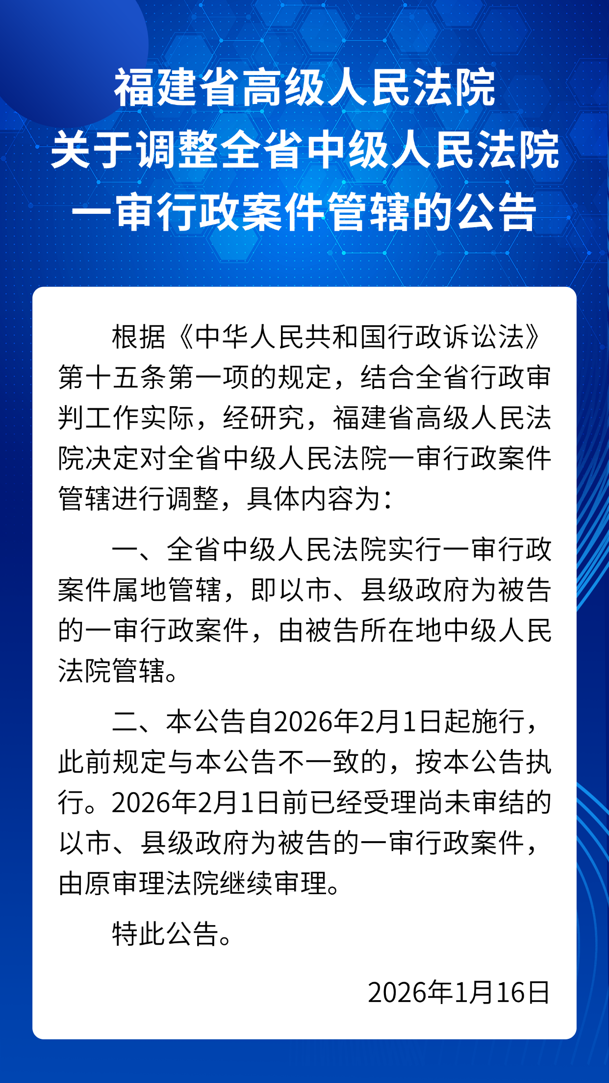 福建省高级人民法院关于调整全省中级人民法院一审行政案件管辖的公告